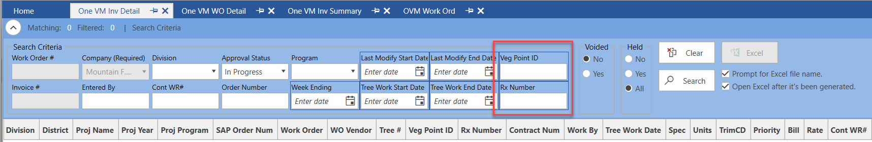 5. OVM: Added search fields for VegPoint and RX Number to WO Detail and Invoice Detail reports