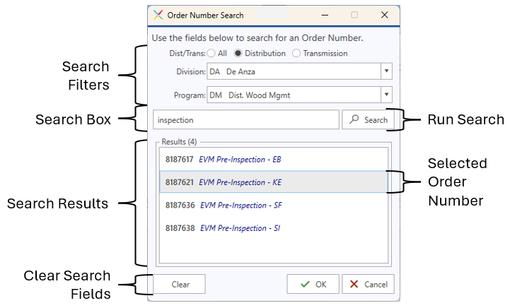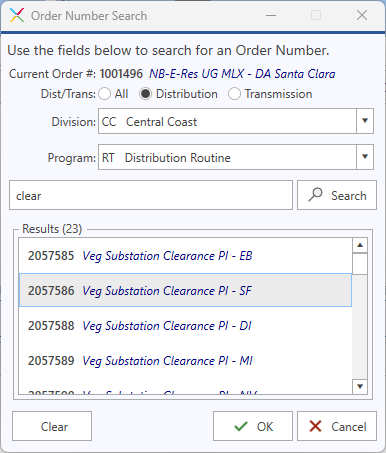 This feature consists of the Order Number Wizard itself. Order Number entry will be the same as before, but if user needs help identifying the correct order number to use, then they can invoke a wizard to search for order numbers that meet their basic search criteria for attributes including Transmission/Distribution, Program Type, Division, and even a text search on order# description.