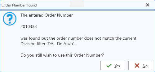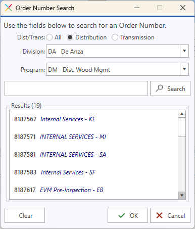 When the order# wizard is called, any fields that have already been filled in on the main order # entry screen will be pre-filled on the wizard for you. This includes Dist/Trans, Division, and/or Program type. When the wizard is called during Edit mode on a previously saved form, or if the user chooses to Edit an invoice header, the applicable search filters will be dimmed out (read only) since they cannot be changed once a form or invoice is saved.