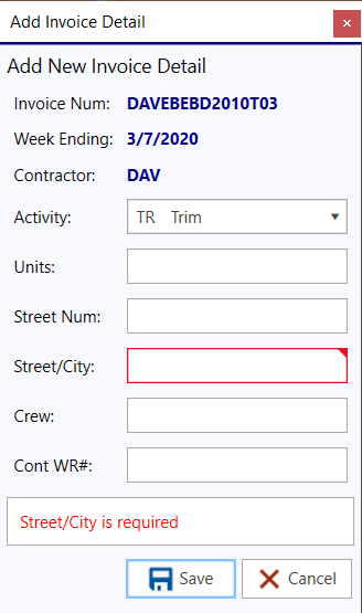 When you are in Edit mode on an invoice, you can add detail records using the Add Detail button. Fill out the data fields for each item (Activity and Street/City fields are required prior to saving).