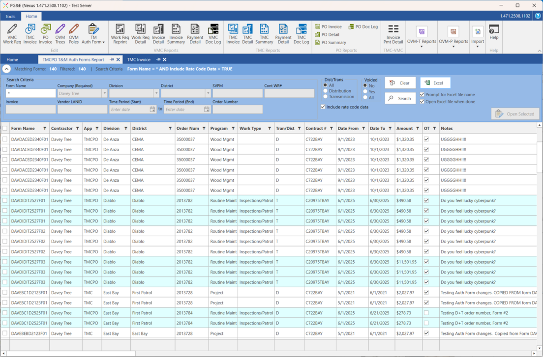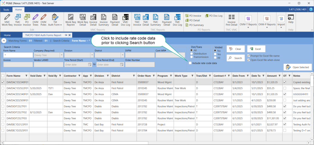 The report can be filtered, and exported to Excel (see TMC Invoice Detail report for more info on how to use advanced search and export instructions). This report also allows user to select one or more forms in the report grid, and then click the Open Selected button to open the forms in the form editor/viewer. A new feature allows you to report on rate code rows by clicking the "Include rate code data" checkbox.