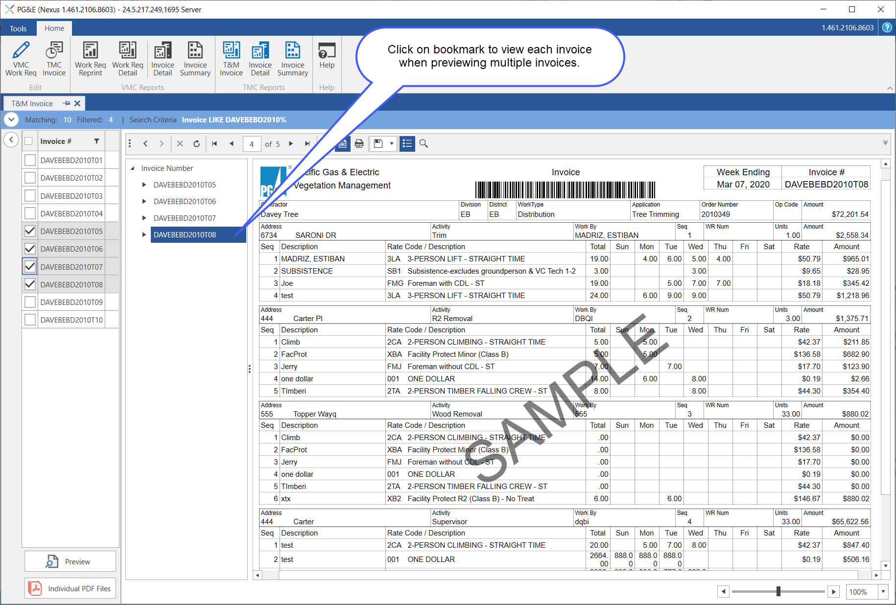 In multiple select mode, there are check boxes next to each invoice#.  You can check all numbers you wish to view/print, and then click Preview to view on screen, or PDF to generate a PDF from the selected invoices. If Preview is selected all invoices will be shown together and you can click on the bookmark to quickly jump to the invoice selected.